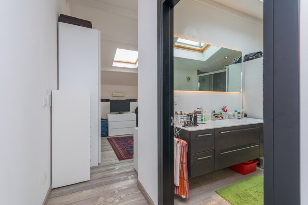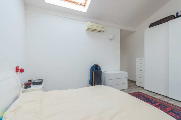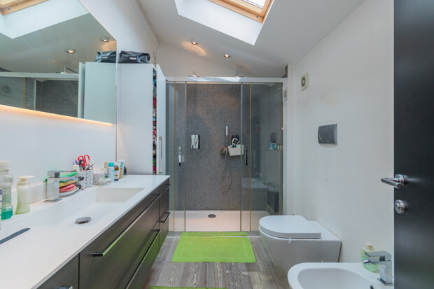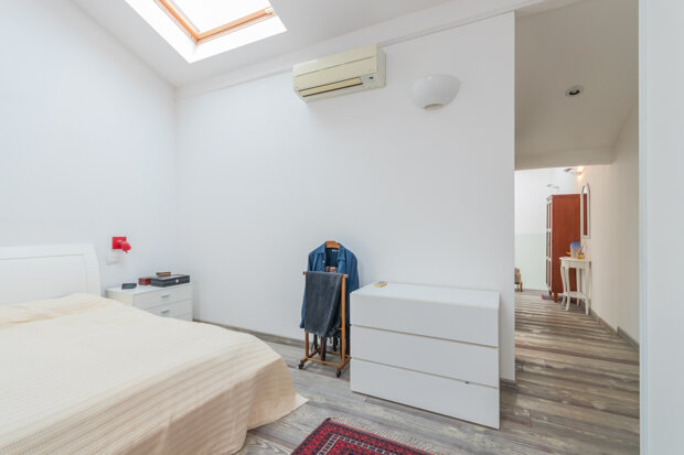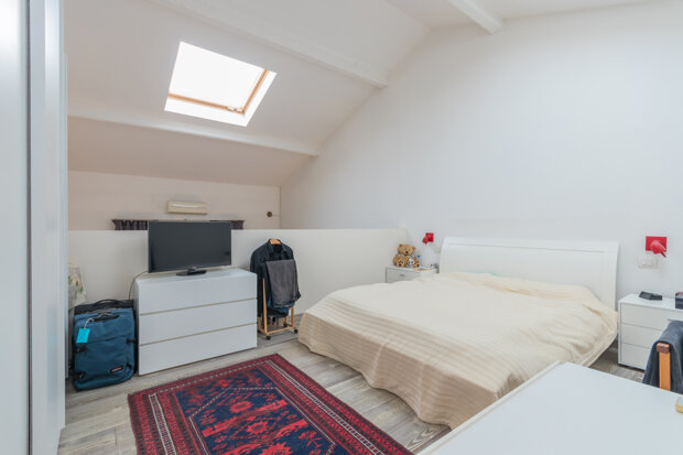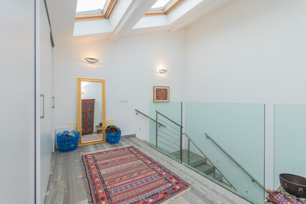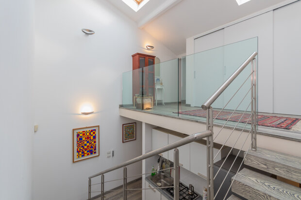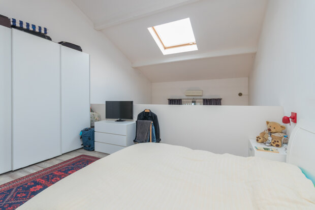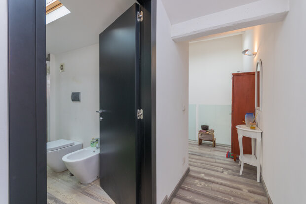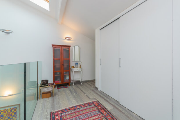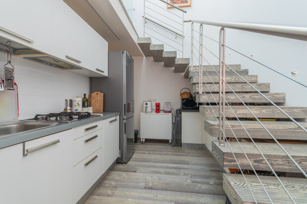 L'abitazione moderna, rifinita con gusto sobrio e materiali eleganti, si sviluppa su due piani offrendo al piano terra un living spazioso su pianta di 70 mq con angolo cottura e bagno, una scala a vista che porta alla zona notte soppalcata, composta di una camera matrimoniale con bagno padronale e stanza guardaroba/studio. La doppia altezza ed i 6 velux a tetto, motorizzati da remoto con tapparella oscurante e sensore anti pioggia, rendono gli spazi particolarmente ariosi e luminosi. Il riscaldamento a pavimento con caldaia a condensazione e la climatizzazione dual split, l'illuminazione ricercata e gli impianti tecnologici, incluso antifurto volumetrico e perimetrale assicurano funzionalità e confort.